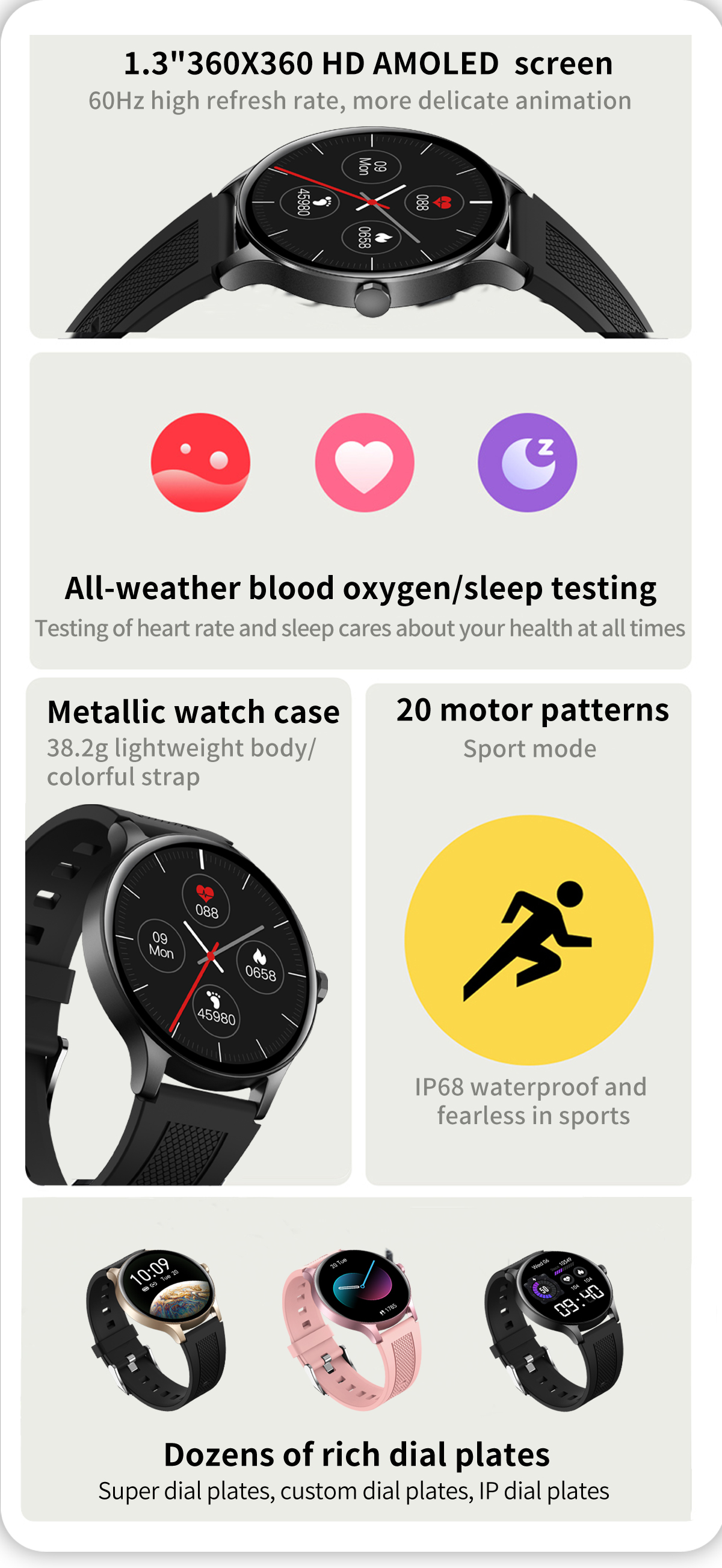Featuring a vibrant 1.3-inch screen, this smart bracelet not only looks good on your wrist but also provides all the essential data you need at a glance. The sleek appearance, measuring 44.6*44.6*9.5MM, makes it a perfect accessory for any outfit, whether you’re at the gym or out on the town.