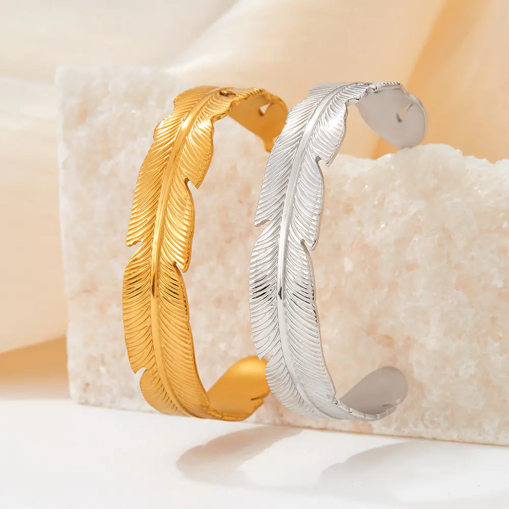 Elevate your look with our Feather Bracelet and Ring Set, a refined two-piece ensemble designed to add instant style to any outfit. This high-end set features a stainless steel feather bracelet paired with a matching open feather ring, available in elegant gold and silver tones.